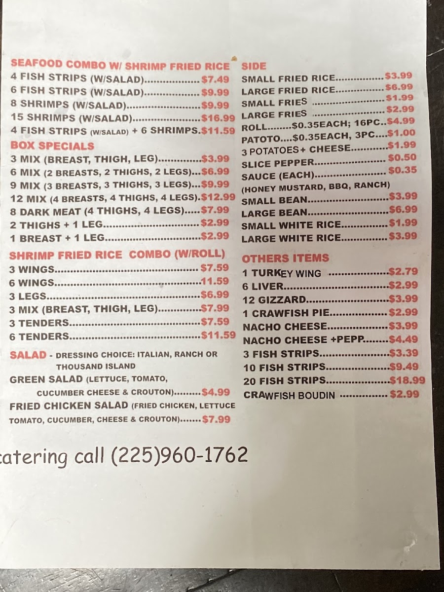- Crawfish Pie and Boudin, each priced at $3.49.